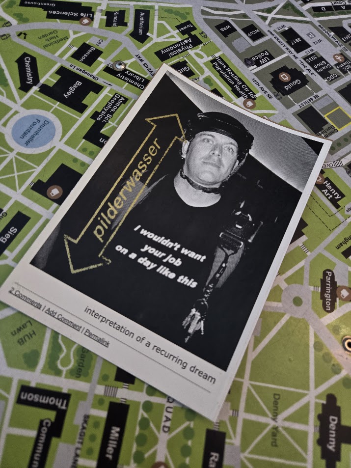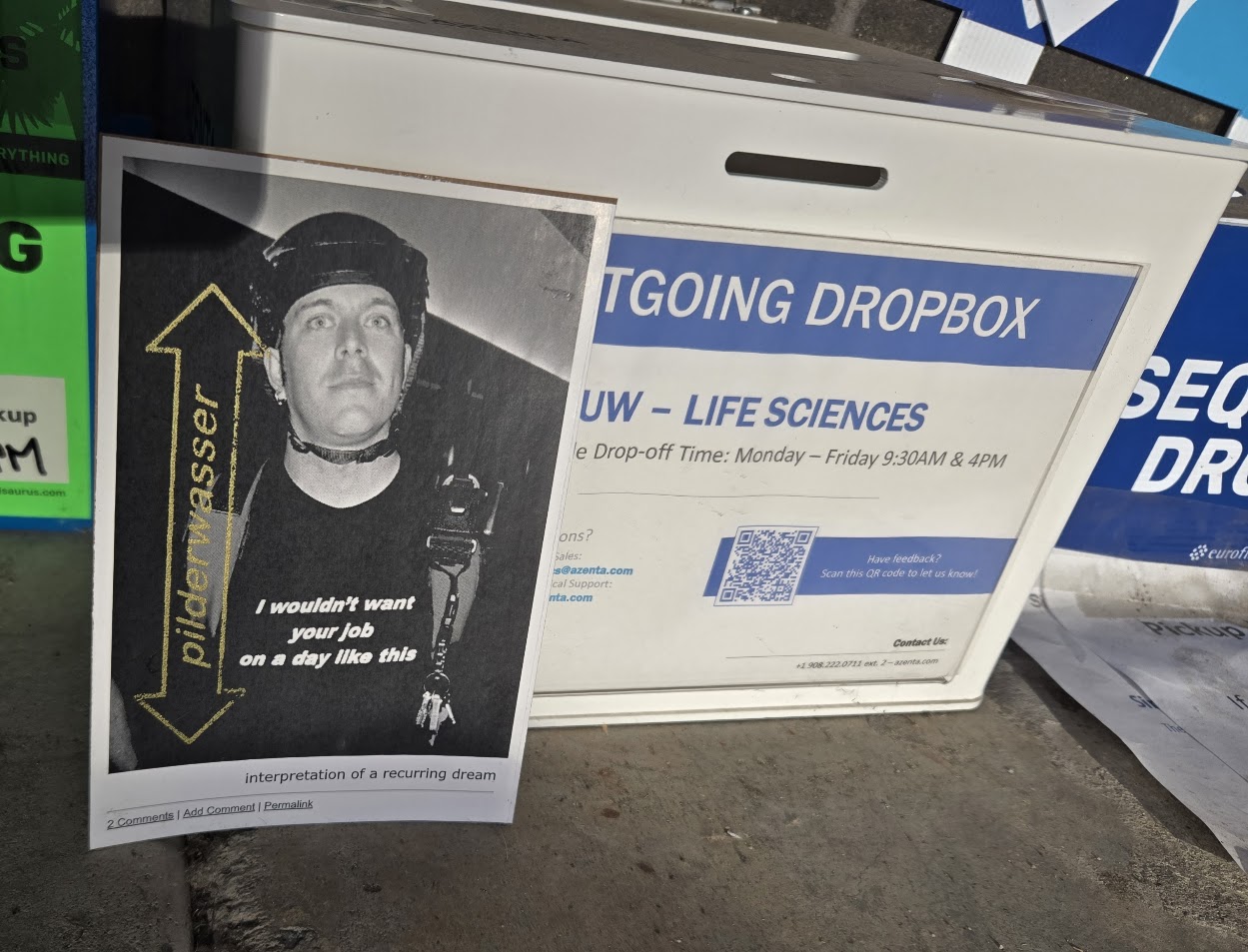 Rolling the wrong way on Okanogan Lane all day — day in day out but today someone rolled up behind me and grabbed my hoodie. My brain rolled through all the what-the-fuck possibilities of who it could be — wishfull thinking — excluding all the fucked up whack job U-district shit show oh shits…  …it was Matt Messenger and we had a little chat as I final fifty fucking feet flipped another AMAZON package. This photo is SIX years old but it’s the same shit different year bro dawg.