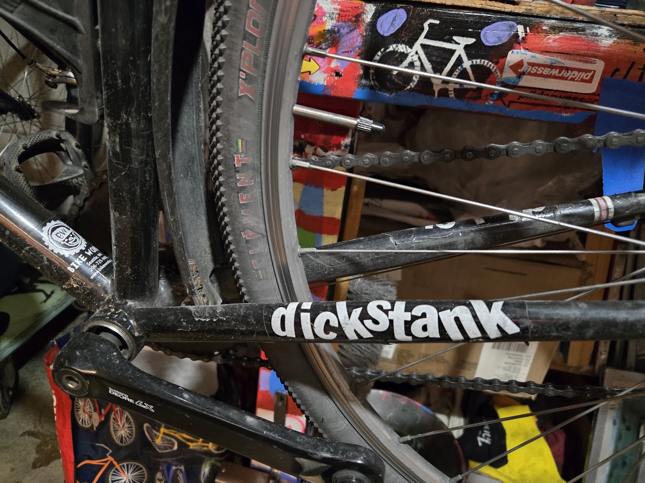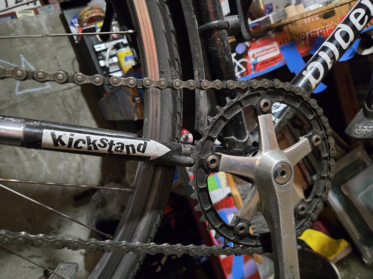 The kickstand font tumble-jumble made its way onto a run or two of arrow stickers. It also made its way into a tattoo on my nondriveside leg. And somewhere along the way someone, perhaps Tyler Goldsmith, took a kickstand sticker and cut & pasted it into a dickstank sticker. The idea stuck and I did a run or two of dickstank stickers too. And then kickstand #11 was dickstank.
