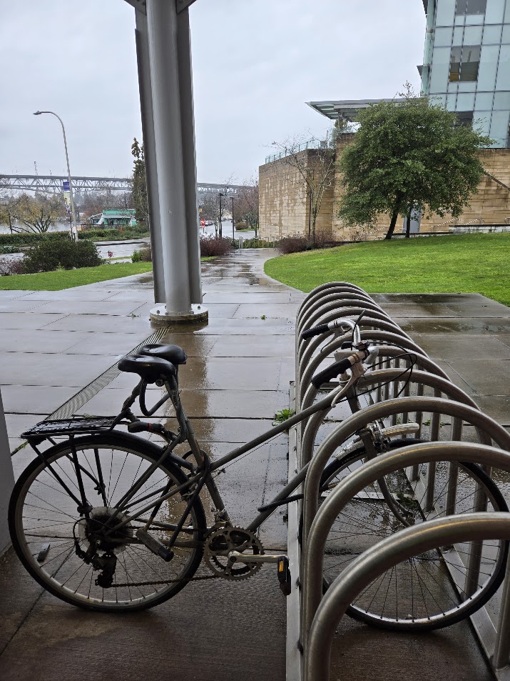 Several hours later in the day in which it never stopped raining I pulled the electric ass bathtub all the way up into a covered cubby near the Ocean Sciences Building door to get out of the rain for a moment and deliver their mail. When I looked over at the bike on the rack I got a vague message from the bike’s owner who passed away a couple years ago.
