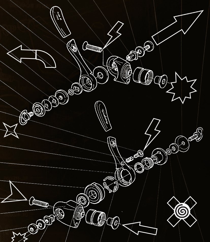 The old Suntour derailleur I’m screening over the elegant Campy record derailleur is from another time, another category, but when they end up together on a scrap of cardboard new things appear. Toss in a few arrow stickers and call it art. With proper postage, call it a postcard.