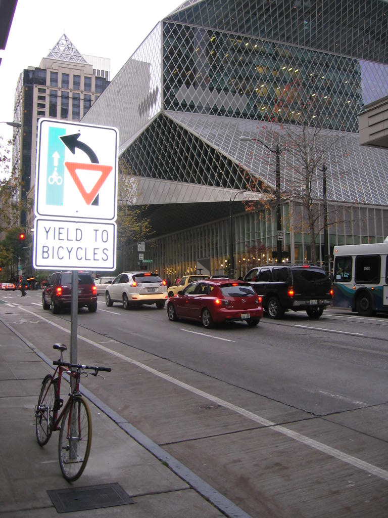 In my legal messenger days (daze) I often found the bike racks outside the office buildings being used by office workers on their smoke breaks to plant their asses. Break time benches so to speak. So I found street signs and parking meters to lock up to. {Insert an ode to the parking meter here} Basic bike racks are cool. But sign posts work too and often work better than aesthetically pleasing poorly designed bike racks.