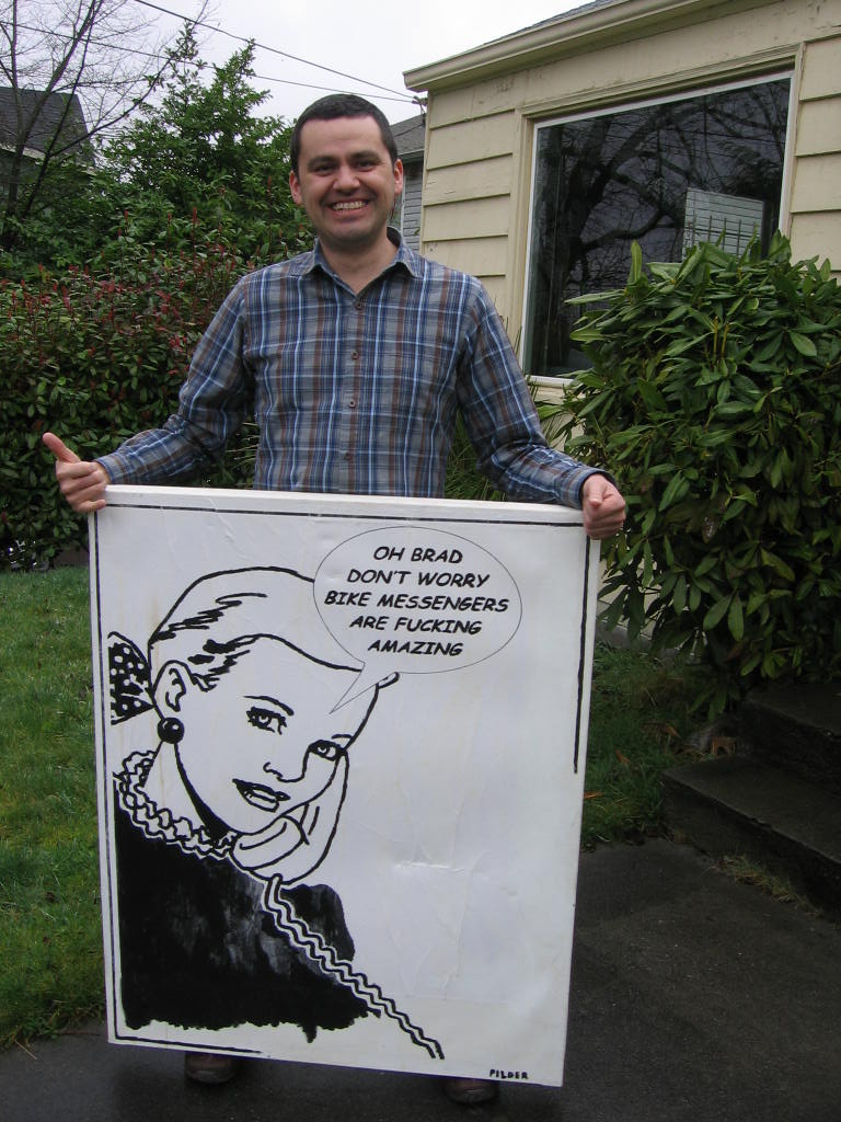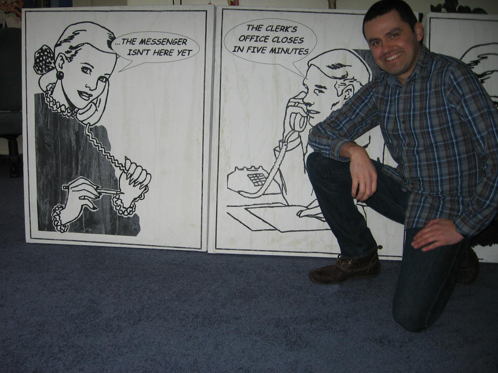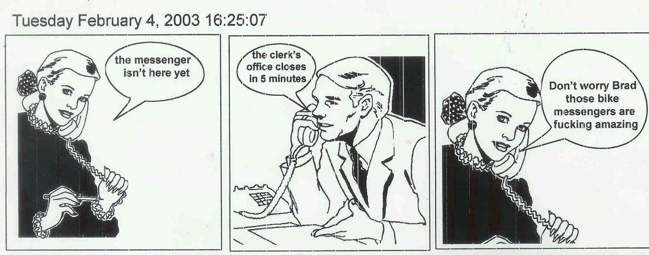 For the art show at the CMWC 2003 in Seattle, I produced a larger-than-life 4’ x 12’ triptych of this little comic strip. Each panel was blown up at Kinkos on the blueprint machine, then wheat pasted and painted onto canvas stretched over wood frames in a d i y garage arts-n-craft weekend fiesta-o-rama.