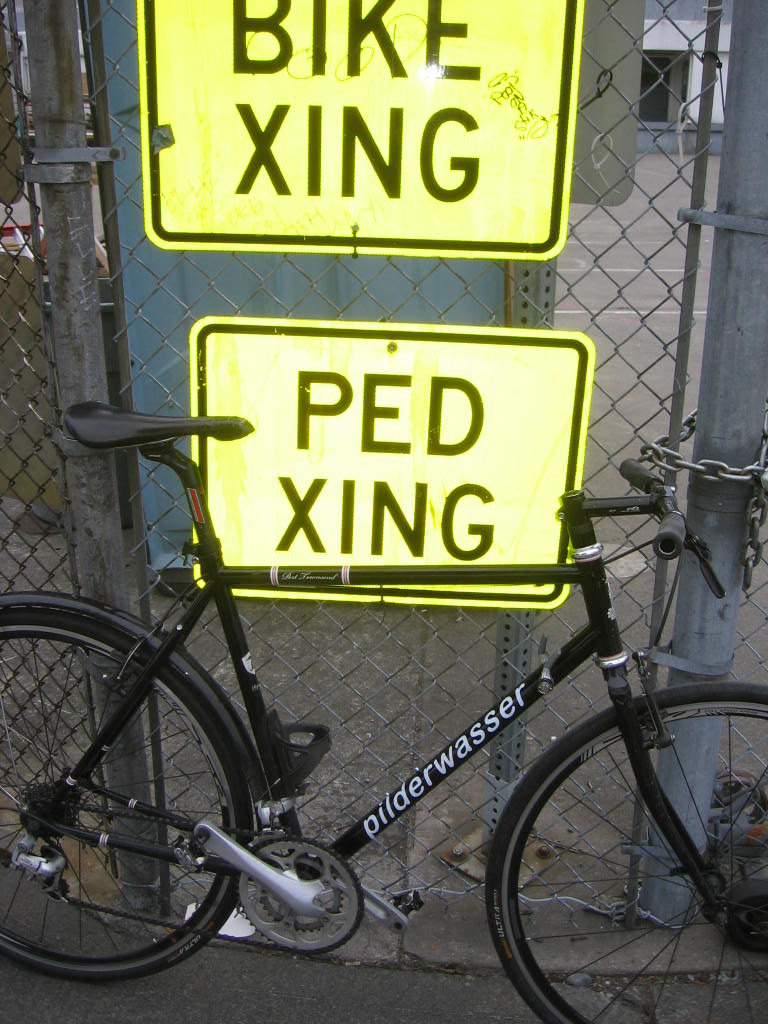 Port Townsend came to town on Thursday and since then has gone on only brief tweaking test rides around the block and one inaugural beer run but it’s only a short time before it’ll be asked to take over commuter duty full time. Early observations include a solid smooth Cadillac quality ride and excellent action on the cantilever brakes (see disembodied hand shadow bike fence photo) Avoiding the lack of foresight hasty hacksaw reaction of a younger man I left the steer tube uncut with spacers stacked up like poker chips because I’m still playing around with the stem and bars and lever levels and it seems prudent to put some miles on it before hacking chopping crimping and feruling.