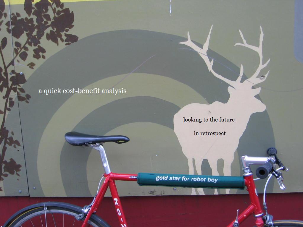 hey there mister hardcore fair weather commuter under inflated OEM tire biopacer bottomed out rock shox clucker if I called you on your left would you turn it against me peering over your shoulder veering swervingly yes I guess so you see what you hear me saying is nothing as you couldn’t hear it anyway in the white noise of the freeway and the jibber jabber of that 96 rock hopper if I had a hammer I’d hammer in the morning I’d hammer in the evening allover this remover installer one inch threadless 130 mm with 25.4 clamp diameter no questions asked up to my ears in too deep 15mm star fangled nut cracker suite like this too shall pass loose balls stiff links close calls stiff drinks plus or minus one more for the road seamless transition smooth handi ramp snot rocket sidewalk free refill at tully’s