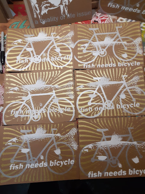 Yesterday I was walking down the street when I saw a guy that got a t-shirt from me seven or eight years ago. But when he washed it, the paint washed out. So I made him another one. Same thing happened. I was dumbfounded. Making hundreds of t-shirts over the years, I never had that problem. It took me quite a while to figure out that the fixer I was using expired and wasn’t fixing anything I screened onto shirts. The fixer additive has a well-defined shelf life and then it becomes worthless. However, you can heat-set the paints into the shirts in the absence of a fixing agent, which is much more labor intensive, but it does the trick. I sort of explained the gist of it to this guy and asked what size shirt he wears, but I remembered he wanted the fish needs bicycle. Last night I made him another t-shirt and today I will be heat-setting the shit out of it and then hand-delivering it in a Tyvek® envelope. Third time's a charm.
