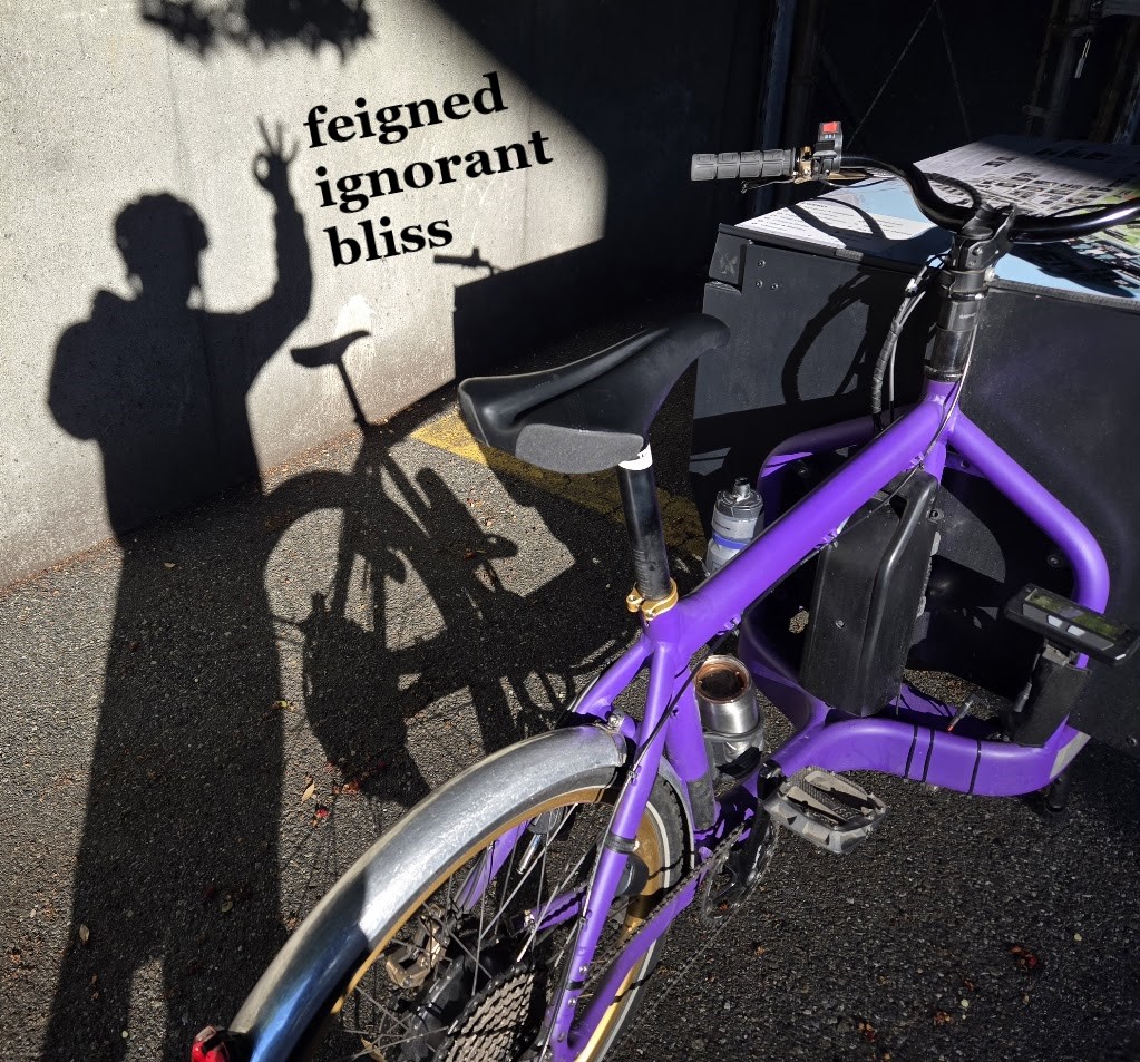 I don’t have to pay for it, or work on it, or call customer service with any questions about it. I just ride it, Mr McFeely like for real, really. While a guy named Alistair builds up the fleet of e-cargo bikes and keeps them all running and repairs all the little shit. All the while I remain blissfully ignorant of the nitty gritty e-bike mechanics, electronics and hydraulics.