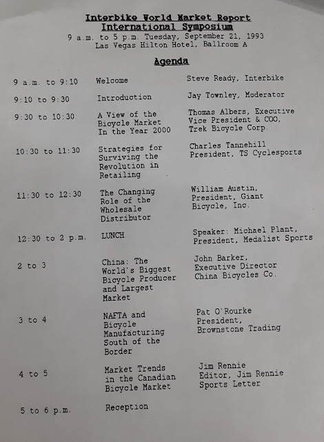 Sunday morning I paid a visit to a thrift store and stumbled upon a slim pleather portfolio in pristine condition. It caught my eye only because it said INTERBIKE 1993 on the cover. Inside was an untouched pad of lined paper and this neatly typed symposium agenda taking place in boring Ballroom A of the Las Vegas Hilton on the Tuesday before the real action started Wednesday or the Tuesday after everyone left town hungover. I have no use for a pleather portfolio but I snapped a photo of the agenda to take a closer look later.