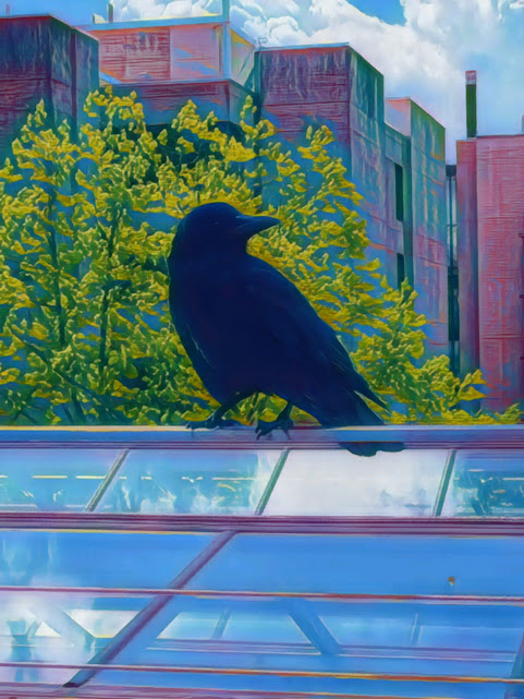 Six stale peanut butter sandwich cracker stacks lined up so so on the LSB loading dock railing bro. The crow snatched one and headed for the nearest puddle to soak it just a bit before she ate it.