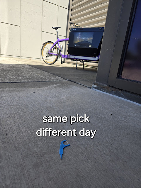 today somebody stole my water bottle with my ABC gum stuck in the nozzle. It was on the electric ass bathtub parked outside the Life Sciences Building at 3747 W Stevens Way. I wish I could have seen the person because I would have just laughed in disbelief watching to see what they’d do with the wad of gum.